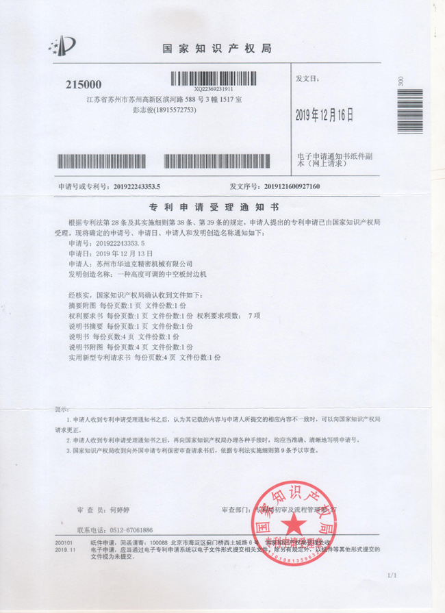 專利申請(qǐng)受理通知書(shū)201922243353.5