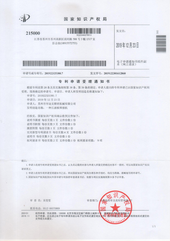 專利申請受理通知書201922325380.7